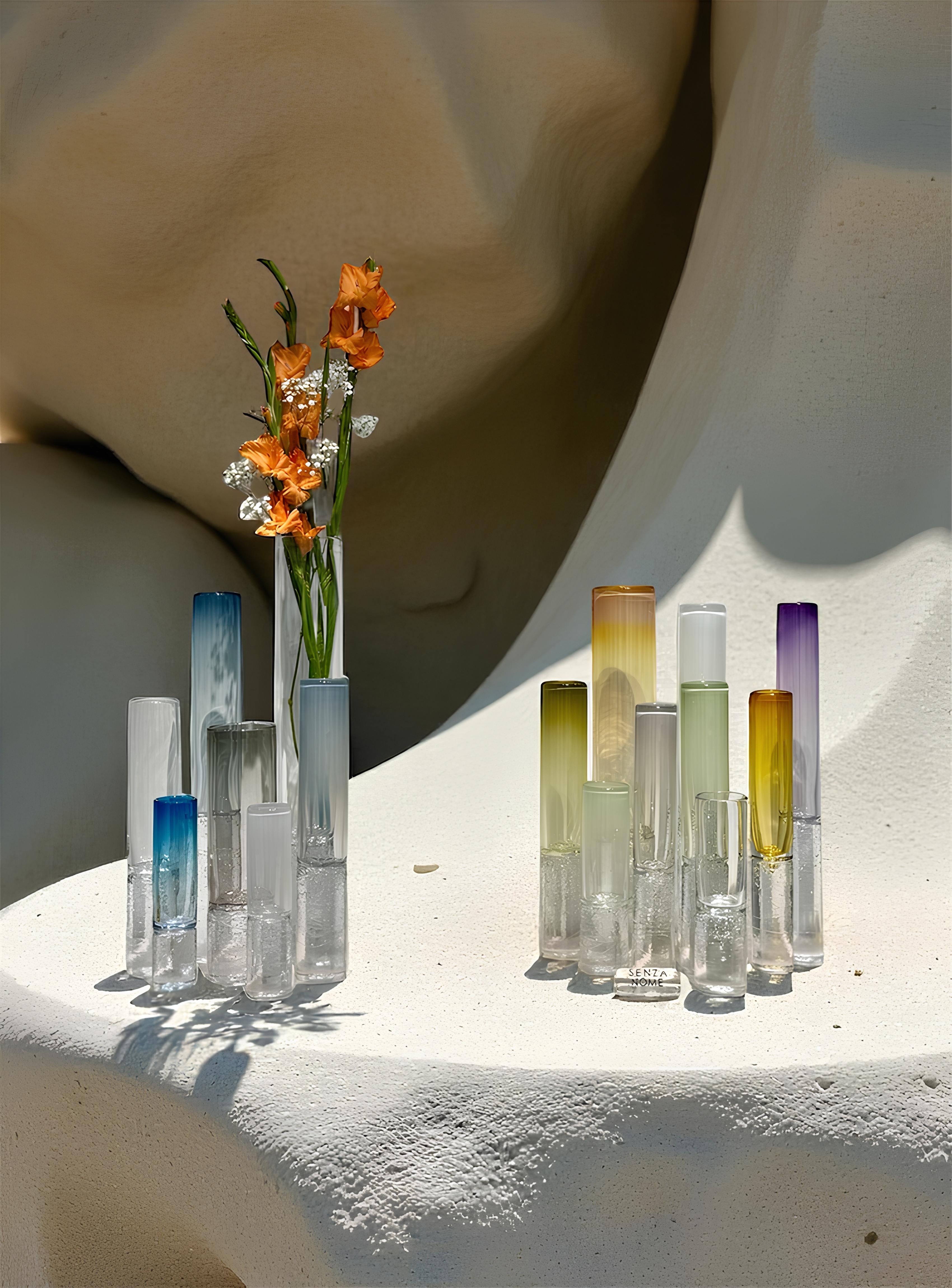 Glass is at the heart of our identity — a material that transforms light into movement and emotion. Through techniques such as hand-blowing, fusing, and sandblasting, we craft pieces with luminous depth, organic flow, and distinctive character. Subtle variations in color and texture make every creation inherently unique and unmistakably handmade.