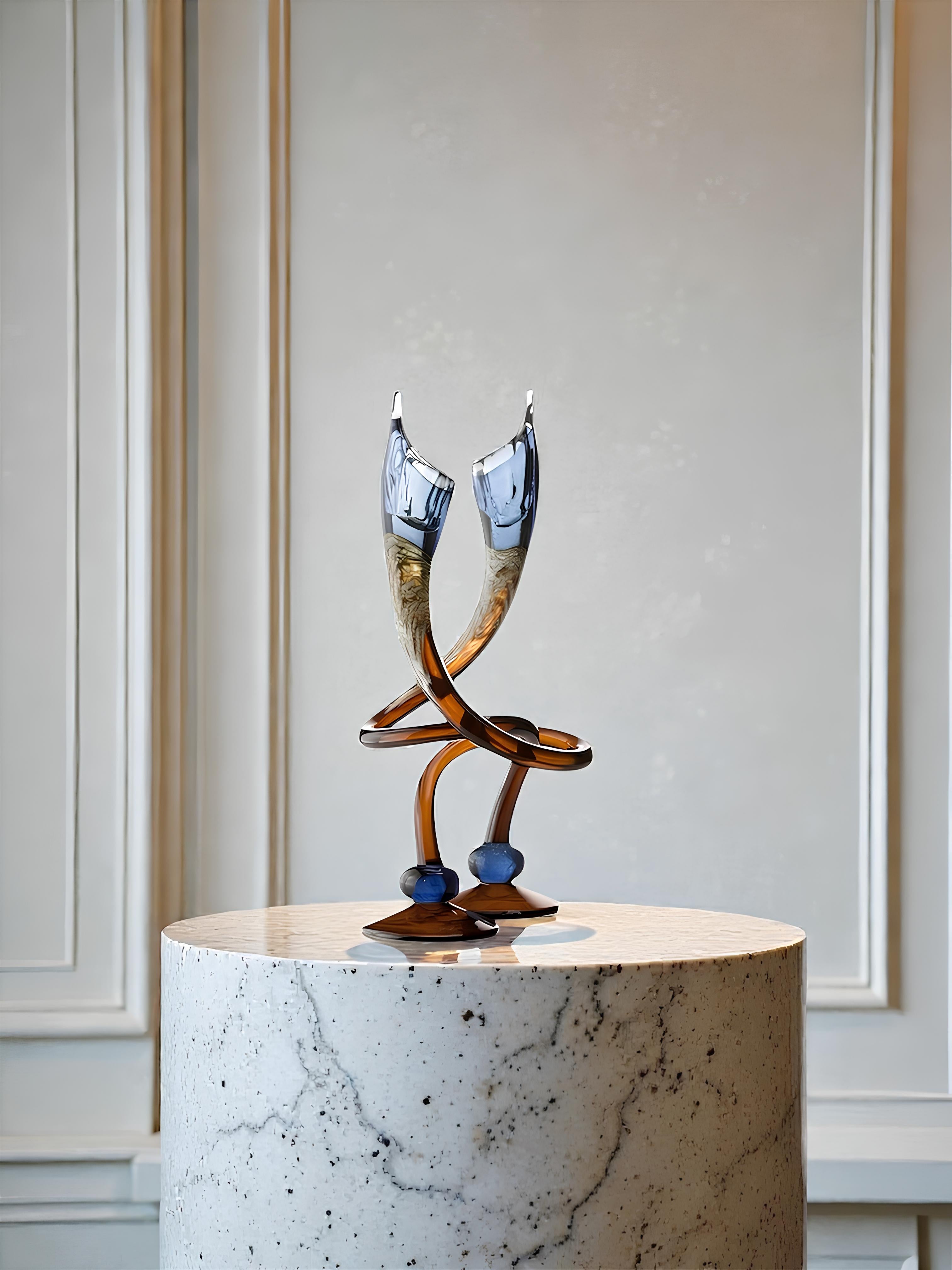 Each candlestick is individually handblown, resulting in subtle variations that make every piece uniquely its own. The twisted silhouette and sculpted top create a dynamic interplay of shadow and reflection, allowing the glass to catch the light in a truly captivating way. Designed to stand beautifully on its own or paired as a set, it brings an elevated sense of artistry to any interior.