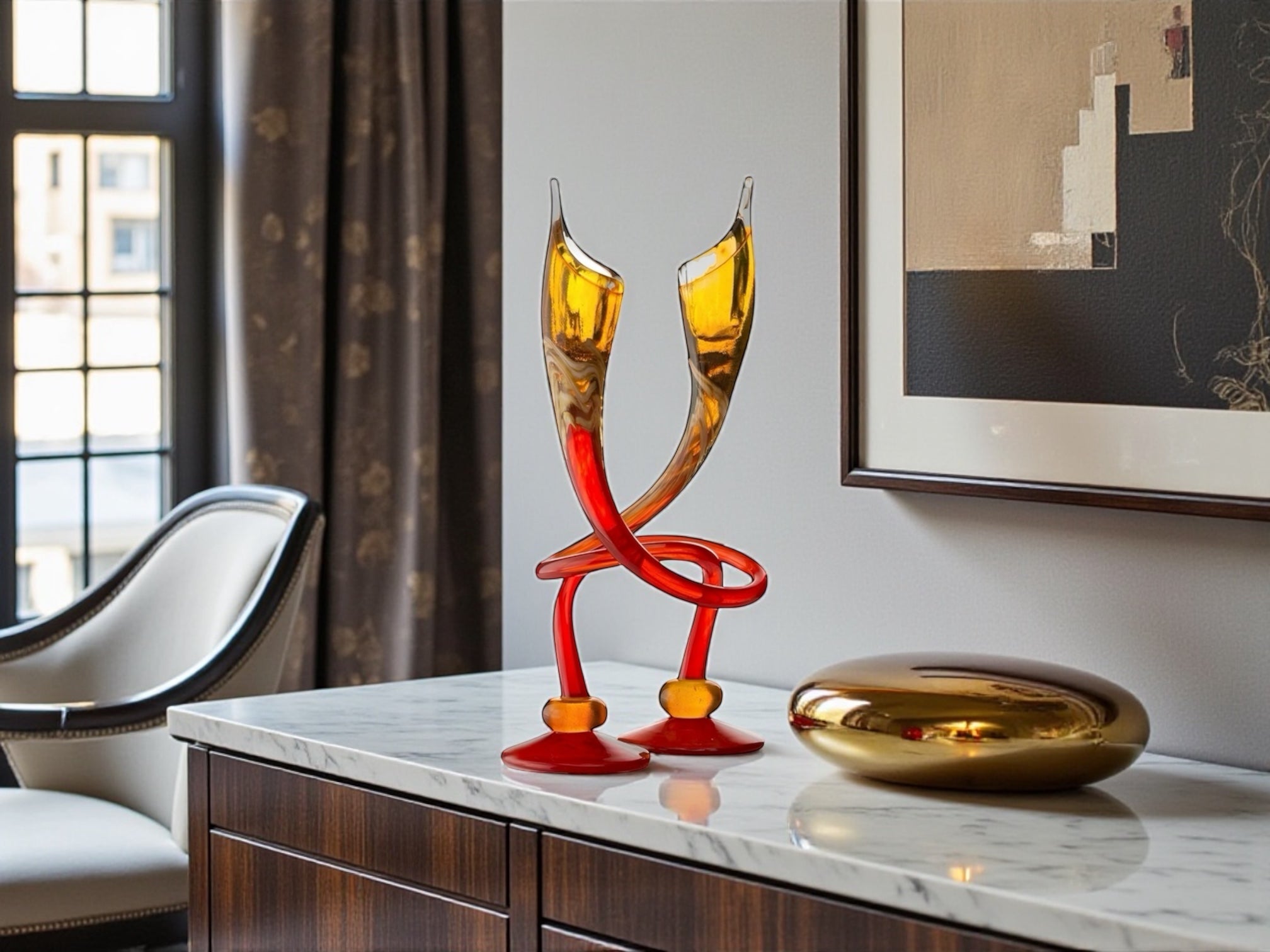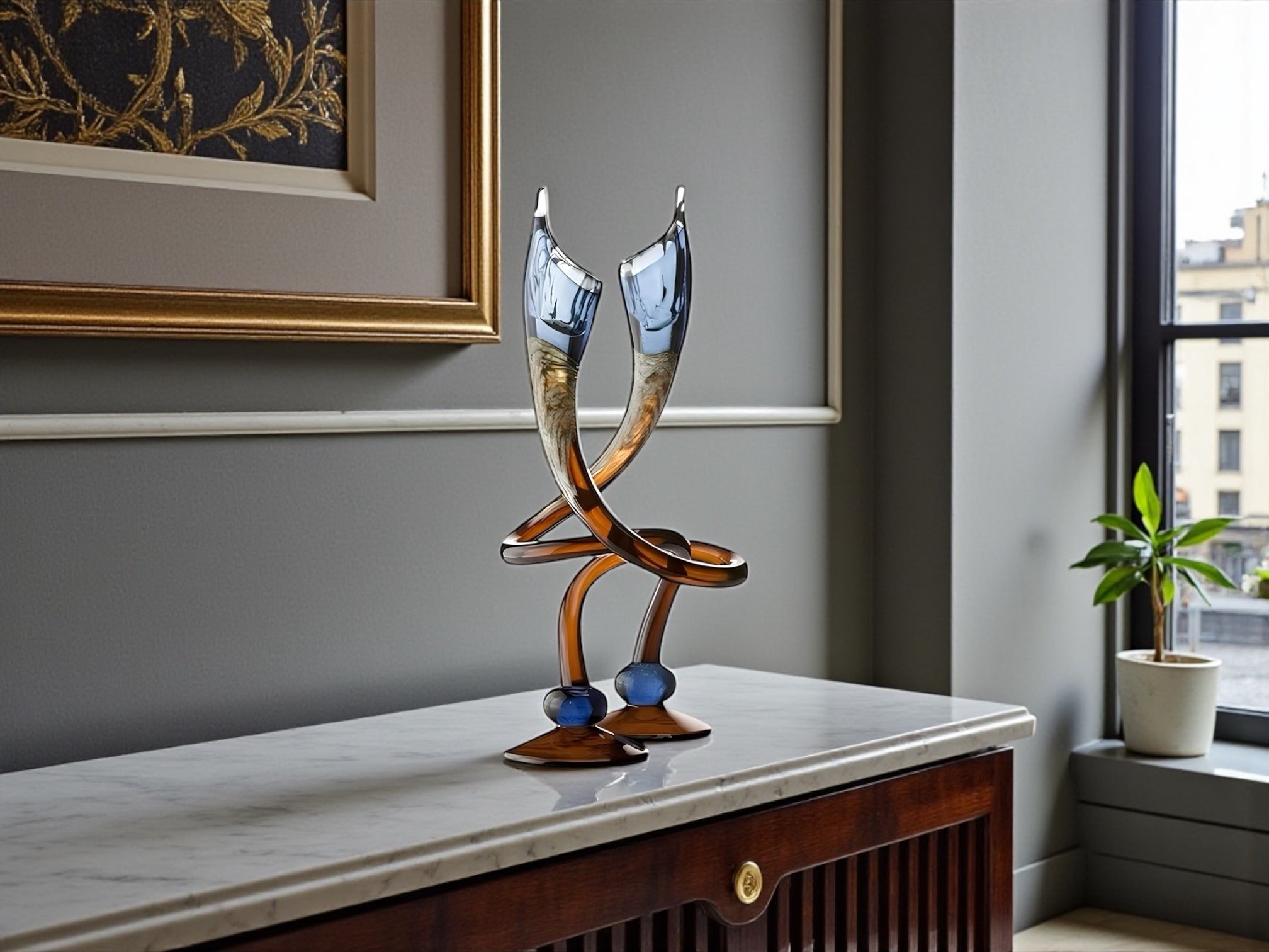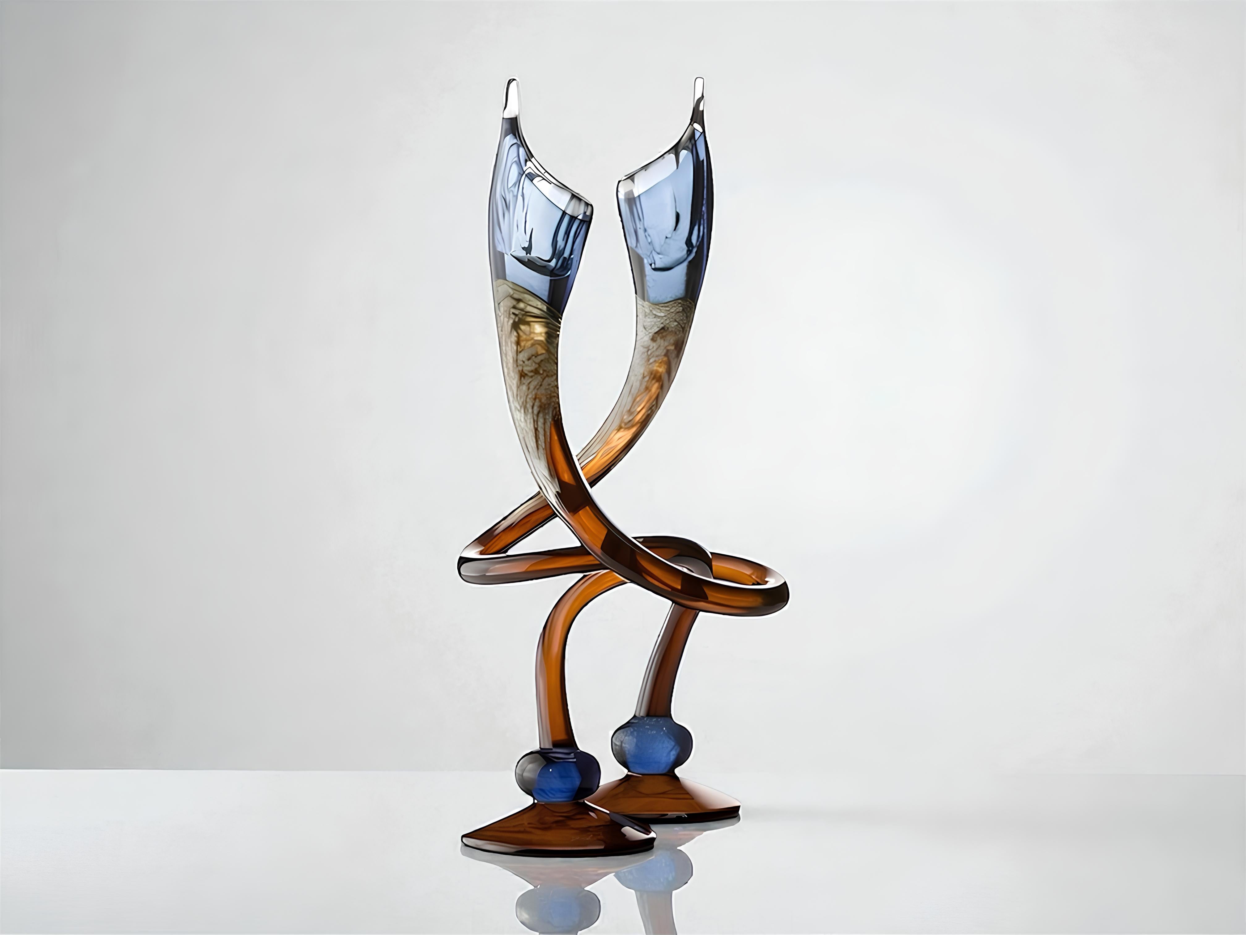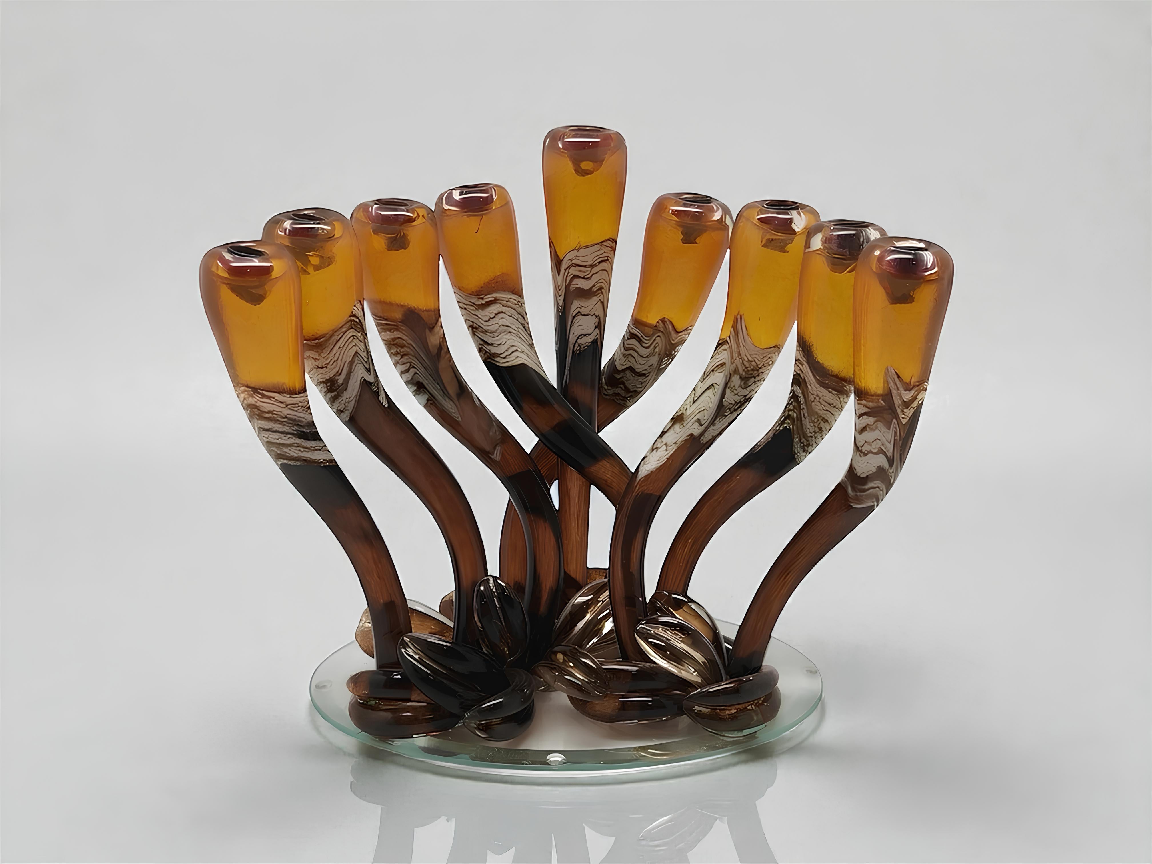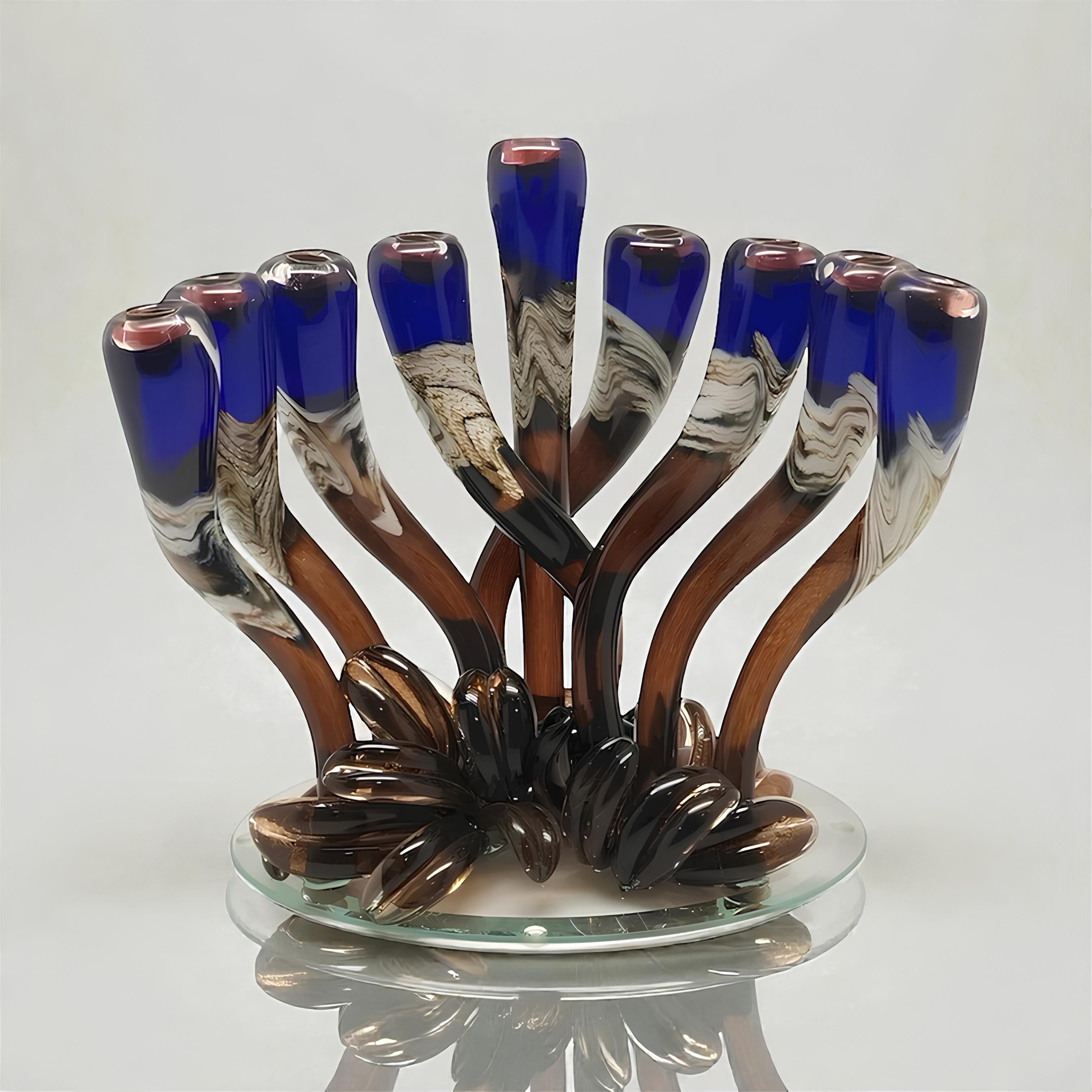 Hand-sculpted by master artisans, each menorah in this collection is formed from richly colored glass, with fluid swirls that make every candlestick completely one-of-a-kind. Copper inserts add a subtle warmth, while the mirrored base elevates the piece with a clean, contemporary glow. The result is a refined, artful object designed to stand out in any curated interior.