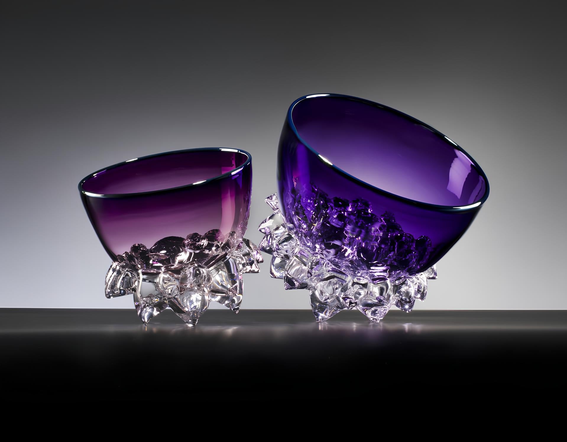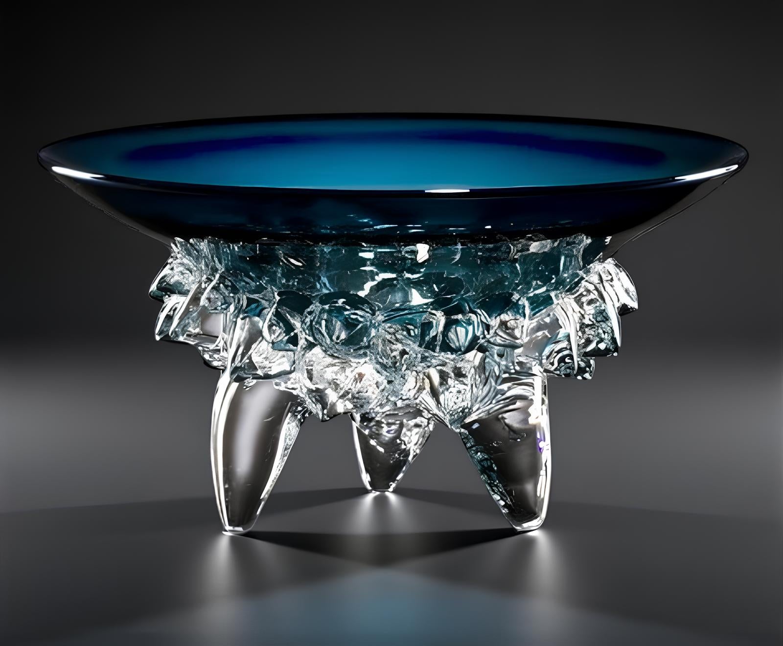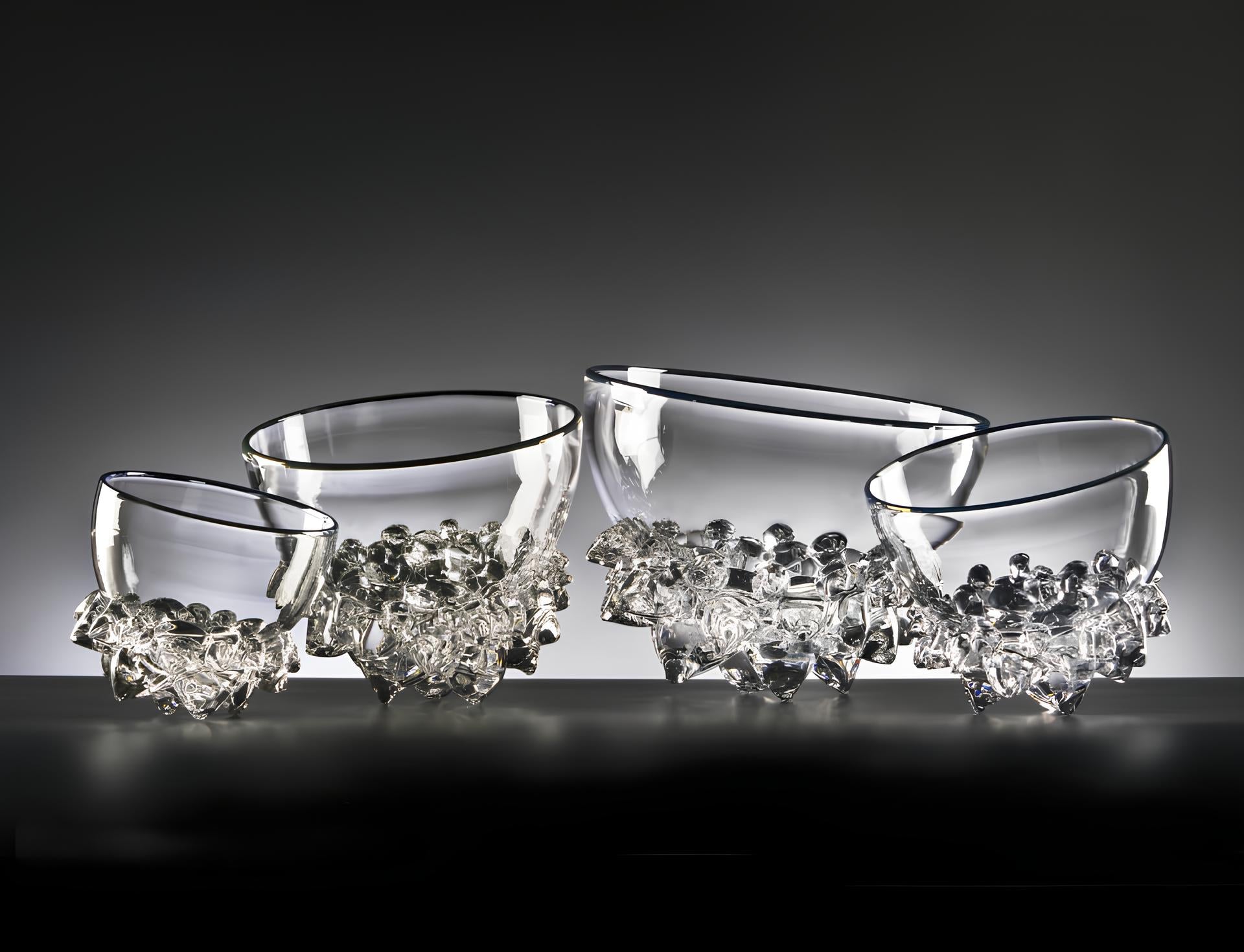 The base of each bowl features ice crystal-like glass protrusions, giving it a unique sculptural character while providing perfect balance and stability.