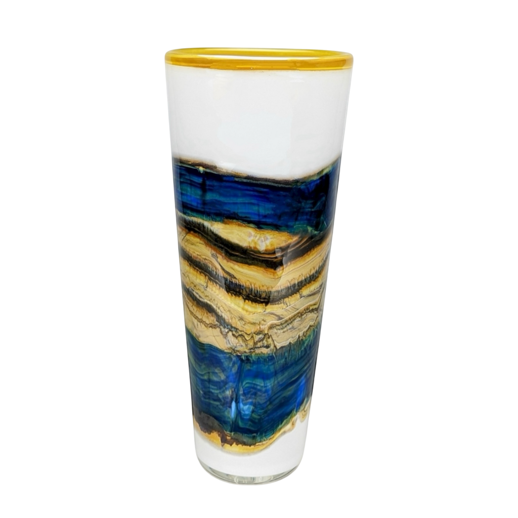 This piece is handcrafted by talented artisans using a special technique to obtain this unique look by layering different colored glass on top of each other.